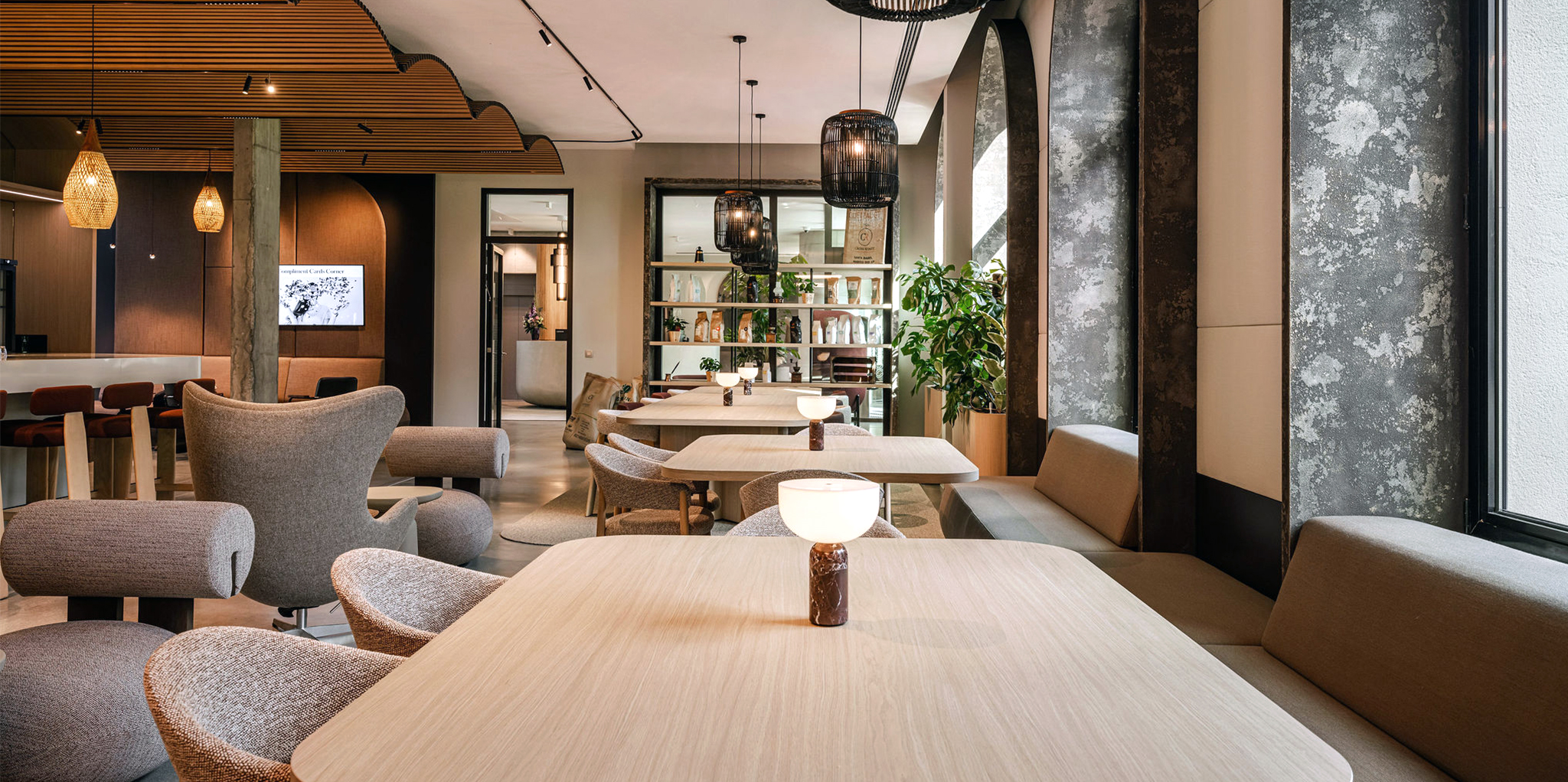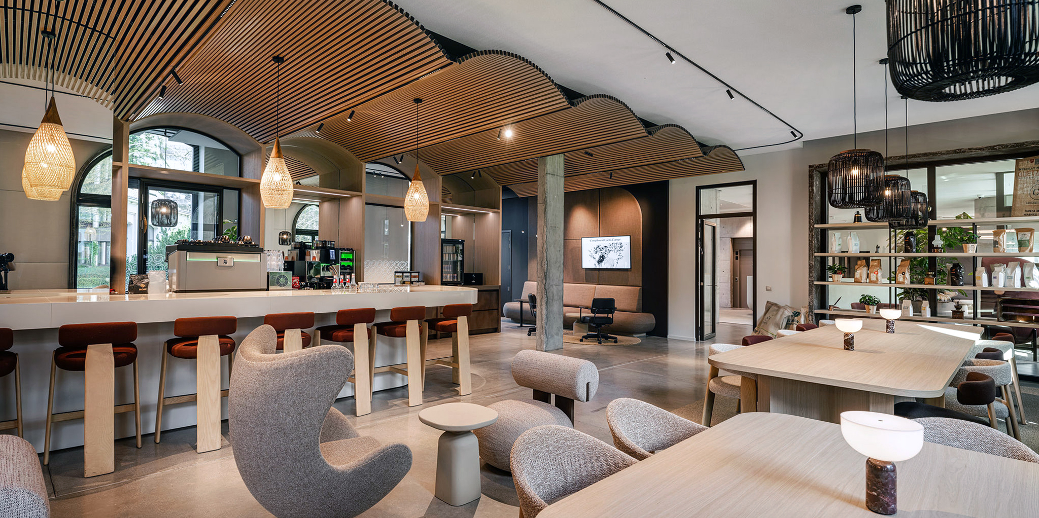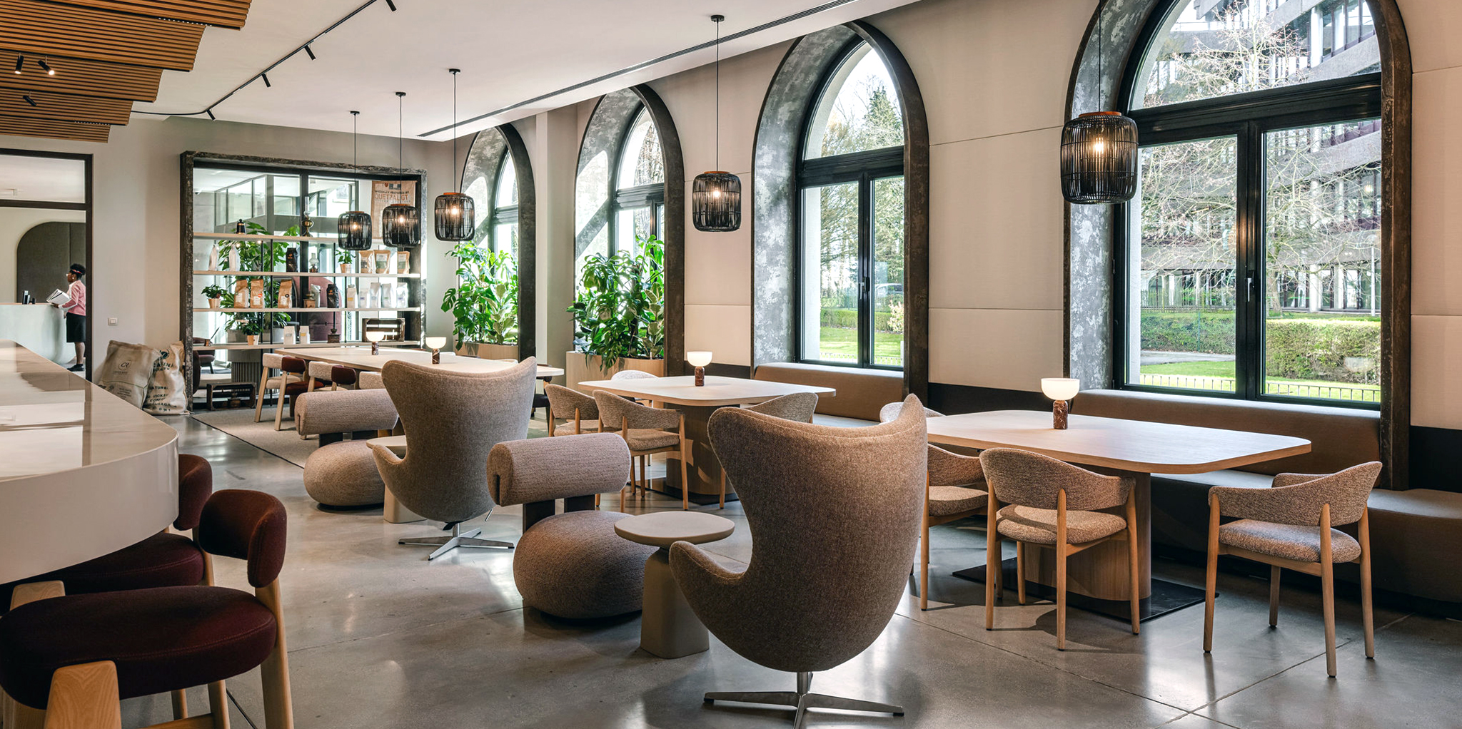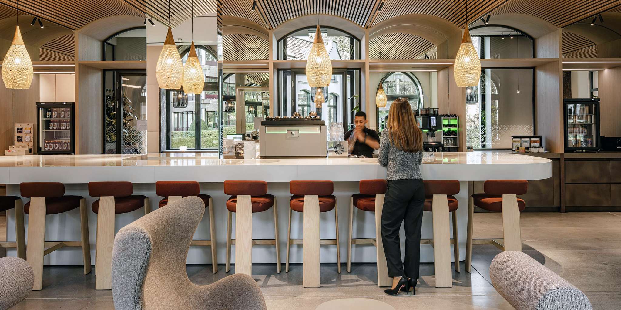 At the heart of both offices is the grand café, a central meeting place that functions as the social anchor of the building. It is a space for informal encounters, spontaneous meetings, and moments of pause, blurring the boundary between working and socialising.